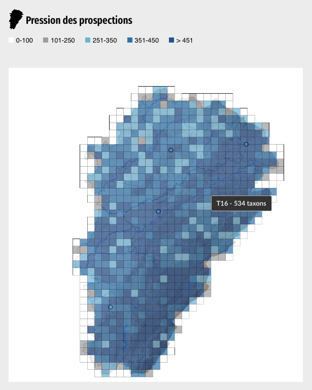 Ces cartes sont générées en temps réel, via les données collectées et validées au sein de notre base de données TAXA. Elles présentent le niveau de connaissance en botanqiue pour les Trachéophytes et les Bryophytes (mousses) et en entomologie pour les Rhopalocères, les Odonates et les Orthoptères.