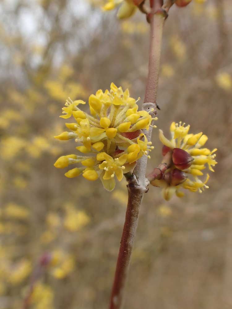 Le cornouiller mâle fleurit très précocement, dès le mois de mars, bien avant le forsythia avec lequel il pourrait être confondu si on ne prend pas soin d’observer attentivement les fleurs.