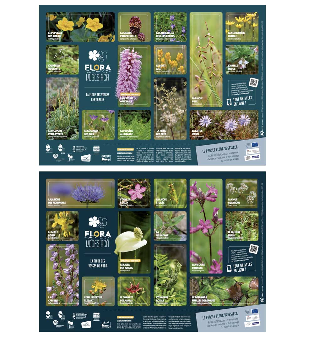 Ainsi, plusieurs supports graphiques ont été créés par le CBNFC-ORI (cartes postales, sets de tables et posters) et ont été diffusés sur les 3 secteurs du massif des Vosges via les Parc naturels régionaux.
