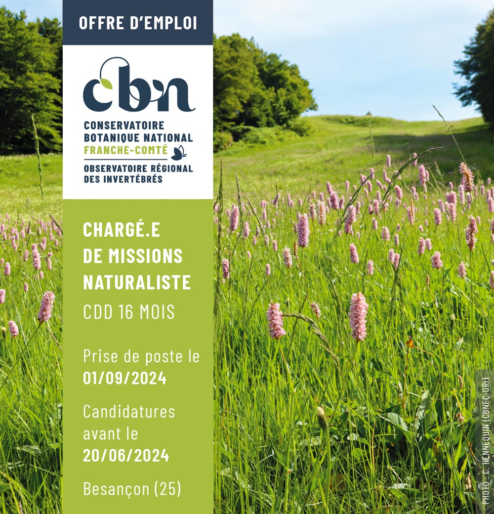 Notre équipe s'étoffe ! Et dans le cadre de nouveaux projets scientifiques, le Conservatoire botanique national de Franche-Comté – Observatoire régional des Invertébrés (CBNFC-ORI) recherche un·e chargé·e de missions naturalistres pour rejoindre notre équipe.