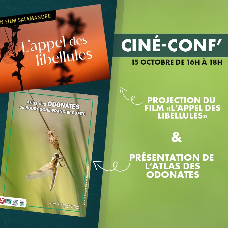 - Ciné-conf’ le 15 octobre de 16h à 18h :Projection du film « L’appel des libellules » (52 min) de Marie Daniel et Fabien Mazzocco (produit par Mauvaises Graines – CEN Aquitaine – La Salamandre) - Amphithéâtre Ampère, Bâtiment Gabriel de l’Université de Bourgogne