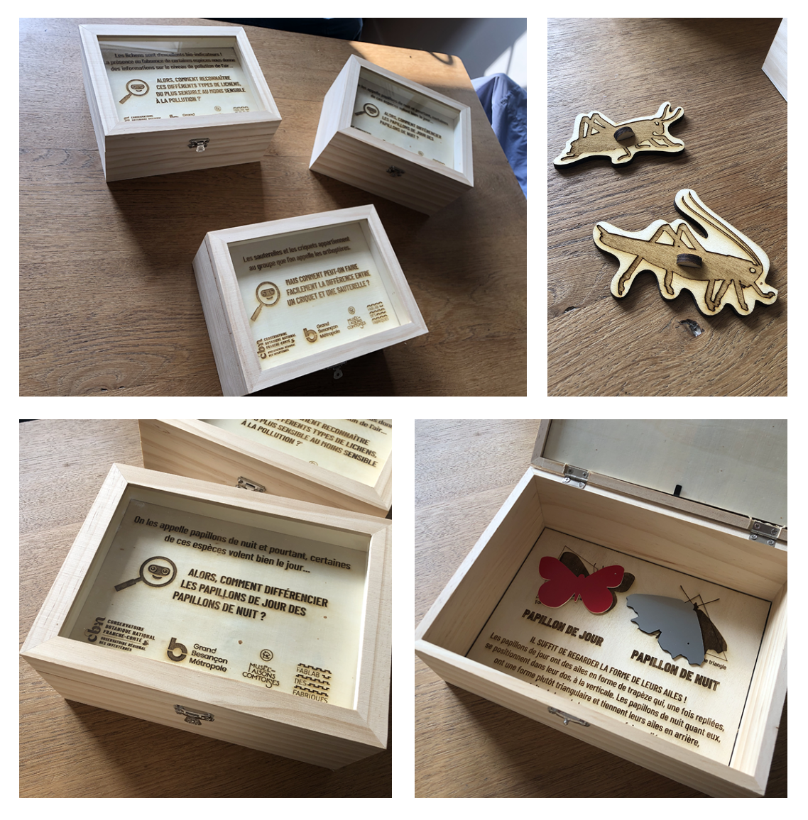 Chaque panneau est également accompagné de bornes en bois, qui invitent le visiteur à manipuler / toucher / ressentir pour apprendre une astuce, et mieux comprendre la nature qui nous entoure.