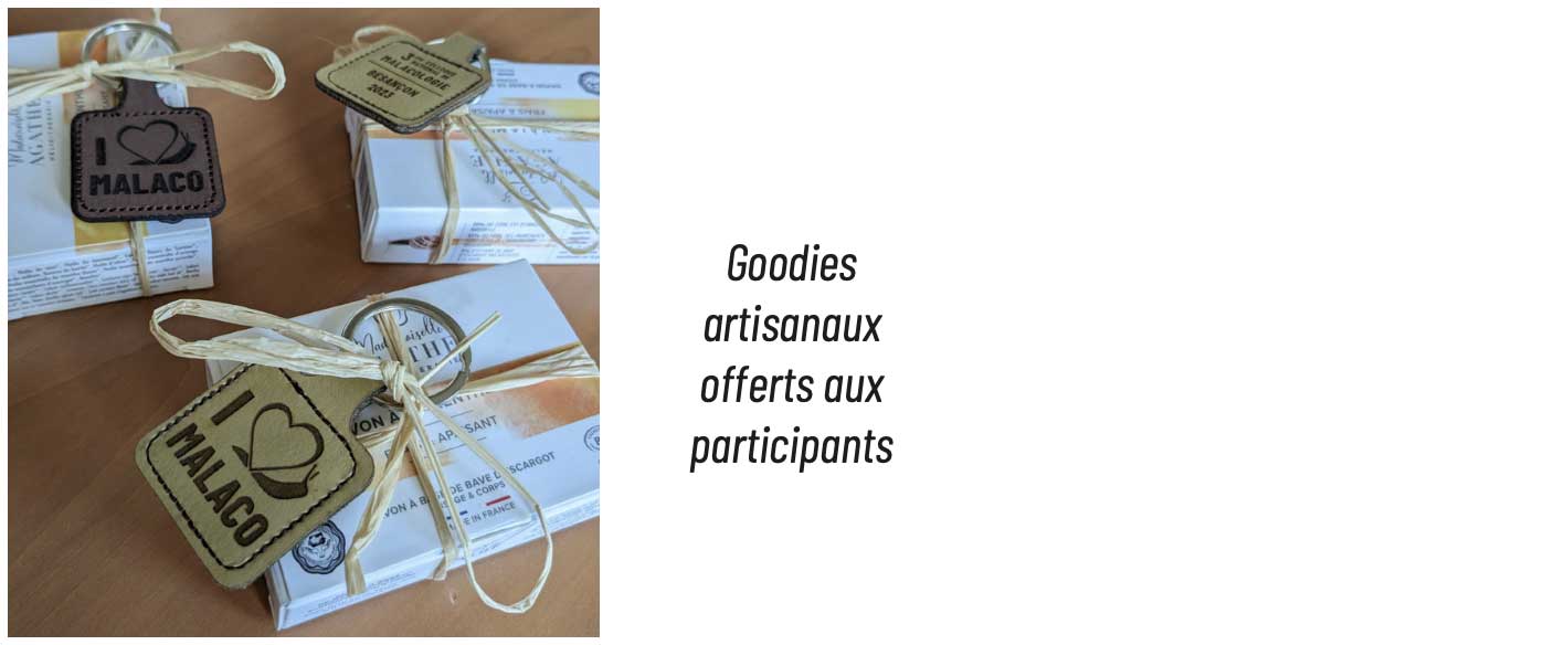 Des goodies artisanaux, réalisés à l'aide du FabLab des Fabriques du Grand Besançon et avec la collaboration de la société Mlle Agathe, ont également été réalisés pour l'occasion et offerts à l'ensemble des participants·es du colloque.