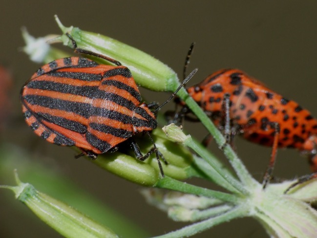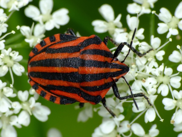 Avec son habit rayé rouge et noir, cette grosse punaise peu discrète est inconfondable en Franche-Comté. Elle est très commune et facile à observer en été.