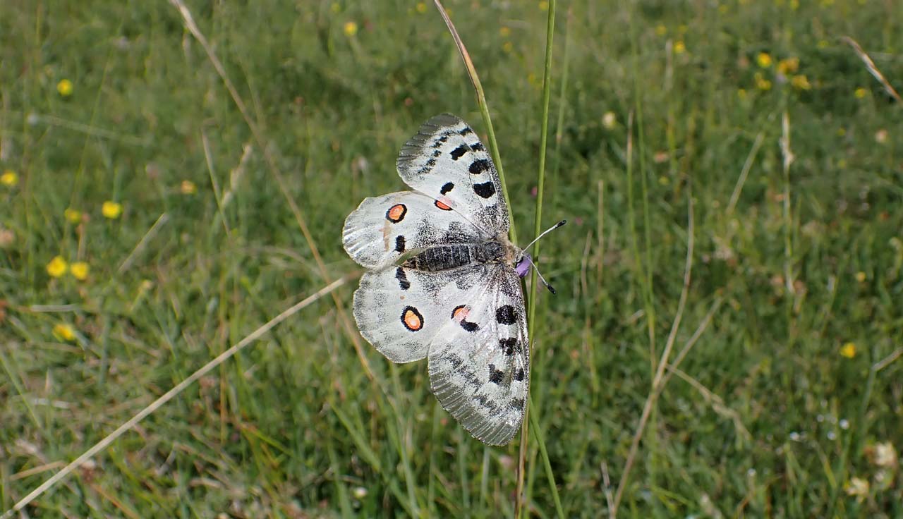 L’apollon est un magnifique voilier qui ne montre le bout de ses antennes que de la mi-mai à la fin août. Il fréquente les pelouses sèches montagnardes à dalles rocheuses riches en fleurs sur lesquelles poussent diverses espèces d’orpins, et notamment l’orpin blanc (Sedum album), plantes nourricières de sa chenille.