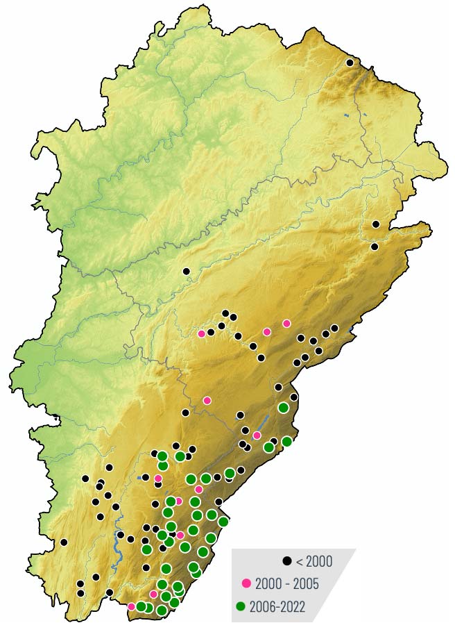Afin d’améliorer les connaissances fondamentales sur sa distribution régionale, un travail de recensement des stations occupées a été engagé entre 2021 et 2023. Les résultats obtenus indiquent que la tendance supposée à la régression s’est confirmée, avec une situation très préoccupante pour le Doubs et une contraction en altitude dans leJura.