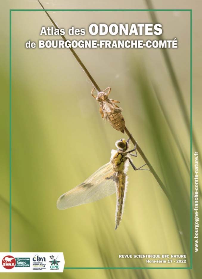Fruit d’un long travail porté par des salariés de plusieurs associations (CBNFC-ORI, OPIE Franche-Comté et SHNA-OFAB) et de nombreux bénévoles, un atlas des odonates de Bourgogne-Franche-Comté est paru en 2022. Cet ouvrage illustre de manière détaillée les 75 espèces présentes en région, leur répartition, leur biologie et les menaces pesant sur elles. Une vingtaine de chapitres viennent agrémenter les monographies, le tout étant richement illustré.