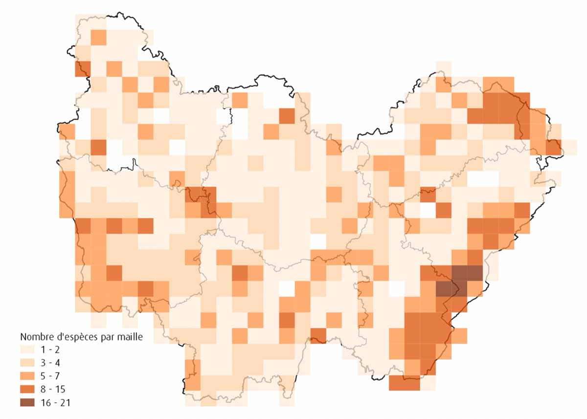 Si certaines espèces de la déclinaison régionale du Plan national d’actions en faveur des libellules sont largement réparties, on constate que certaines zones concentrent le maximum d’enjeux. C’est le cas des massifs du Jura, des Vosges et dans une moindre mesure de celui du Morvan, ainsi que des principaux grands bassins versants de la région (Loire, Saône et Yonne). D’autres hotspots apparaissent çà et là en raison d’une concentration d’étangs de très bonne qualité.